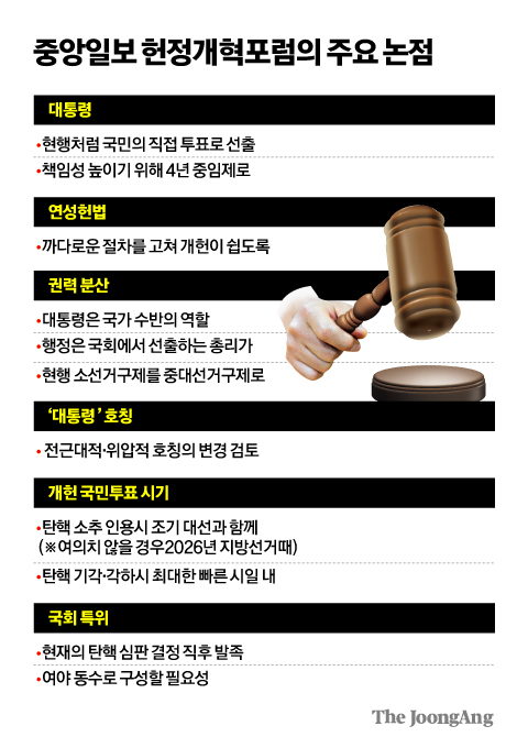 중앙일보 헌정개혁포럼=비상계엄 선포로 촉발된 위기를 국가 시스템 재설계를 위한 전화위복의 기회로 삼자는 취지에서 지난 1월 9일 발족했다. 헌법학 권위자인 정종섭 전 행정자치부 장관, 새정치민주연합(더불어민주당 전신) 원내대표를 지낸 ‘개헌 전도사’ 우윤근 전 주러시아 대사, 정치학자인 강원택 서울대 교수와 박명림 연세대 교수, 이하경 중앙일보 대기자가 위원으로 참여했다. 다양한 개헌 관련 제안을 내놓을 예정이다.